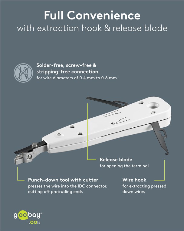 - Mit integrierten Haken, um bereits vorher oder falsch installierte Drähte aus der Klemmleiste zu entfernen, ohne benachbarte Drähte zu beschädigen