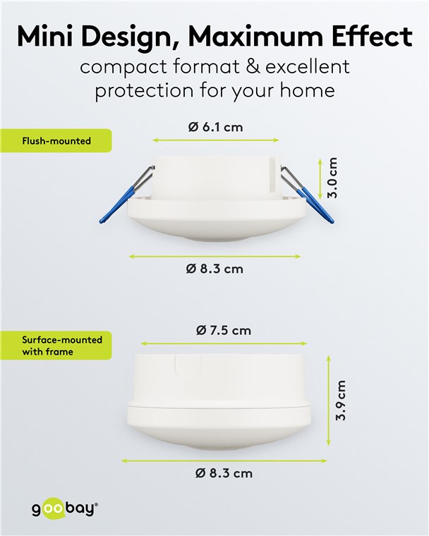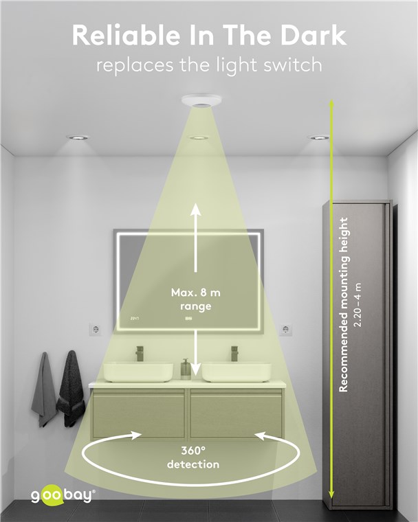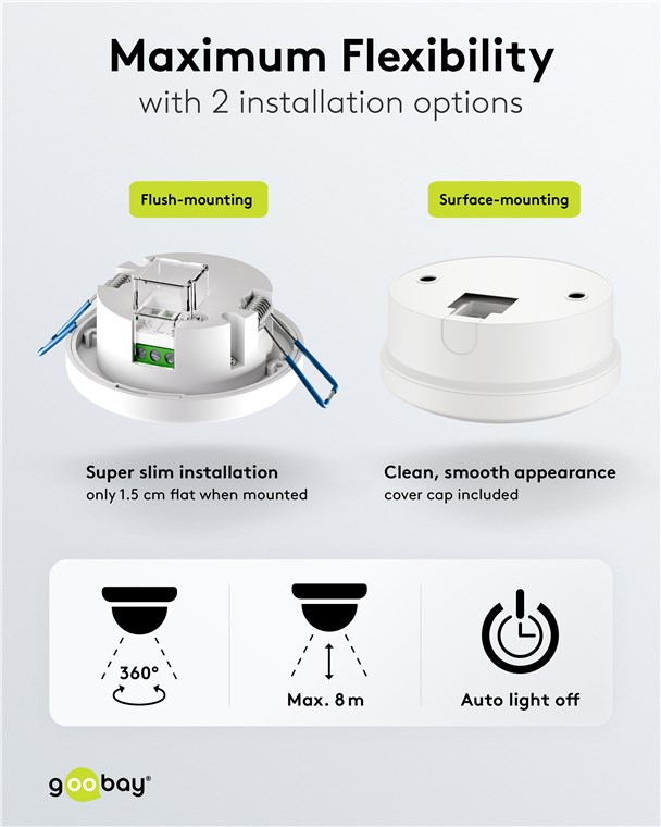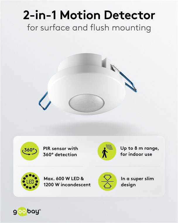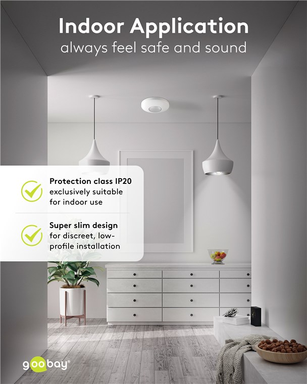 Flexibility is key: The motion detector has two clips for secure flush mounting. If necessary, the clips can be removed to convert the motion detector into a surface-mounted version using the supplied canopy. With both installation options, it is perfect for corridors, bathrooms or hallways – the motion detector always reliably activates the connected lighting.