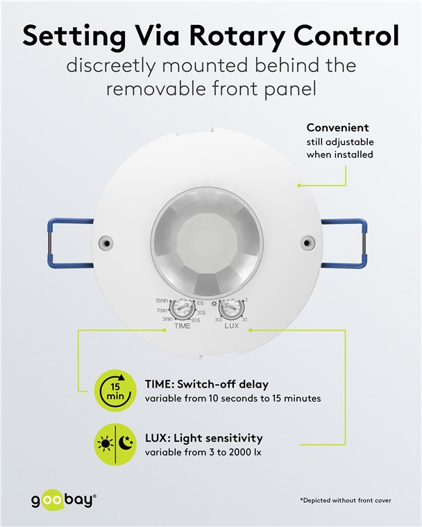 - Discreet appearance, easy to use: The rotary controls for light sensitivity and switch-off delay are located under the removable cover to adjust the settings at any time – without dismounting and without tools