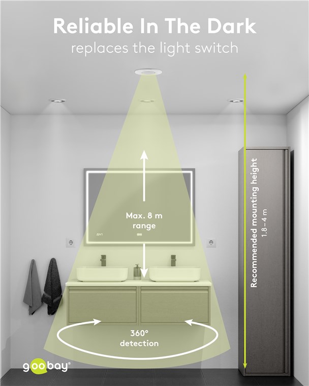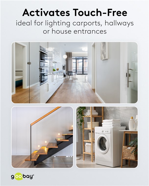 - Replaces the light switch and switches without contact: Particularly practical in rooms that you enter with your hands full, e.g. hallways or utility rooms