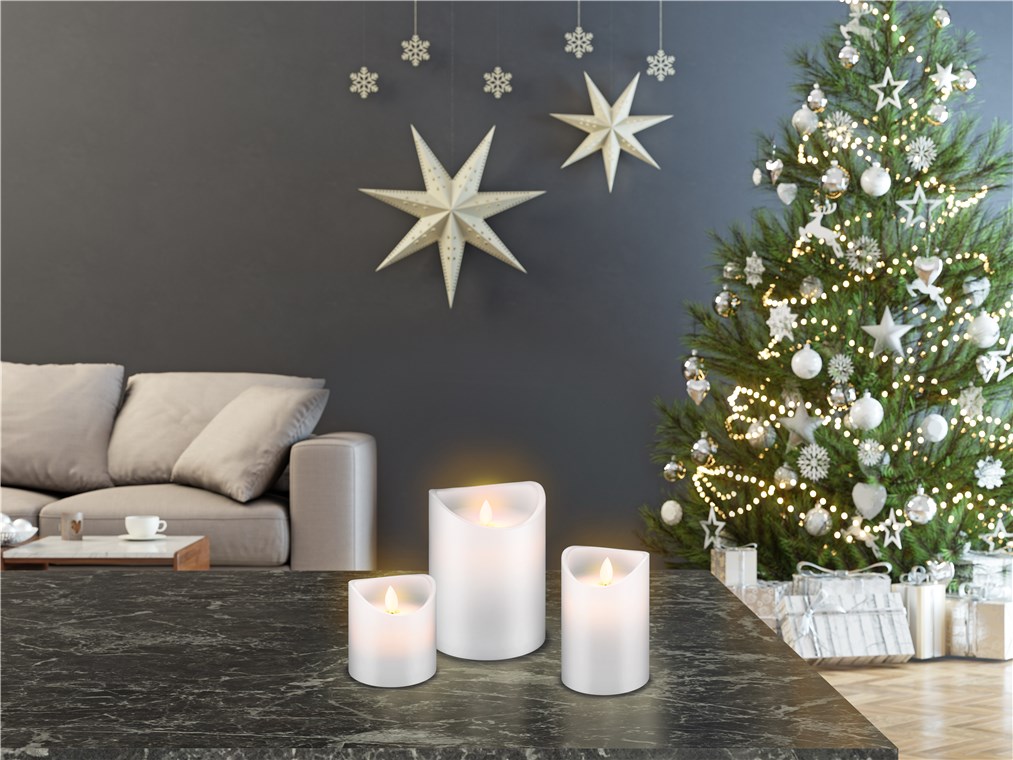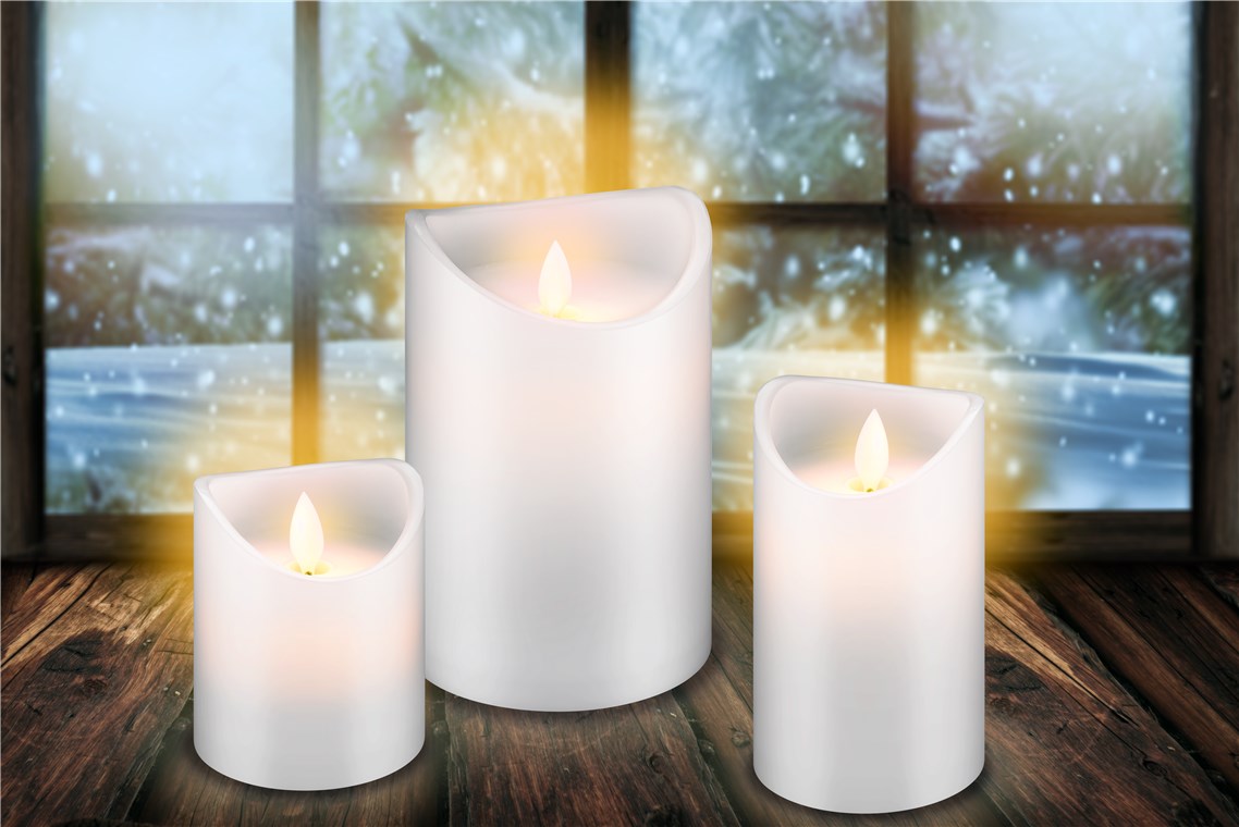 - Stylish pillar candle with real wax cover for warm candlelight with a naturally flickering flame – completely electric and completely safe