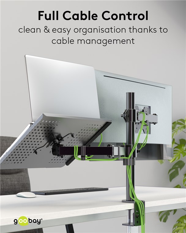 - The integrated cable management system of the monitor mount protects the connection cables and ensures a clean look without cable clutter