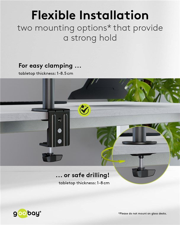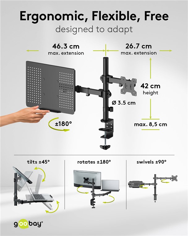- Perfect for stable table mounting of a screen up to 10 kg and a laptop up to 4 kg, height-adjustable, ±90° swivel and ±45° tilt, ±180° rotation, recommended tabletop thickness: 10-85 mm