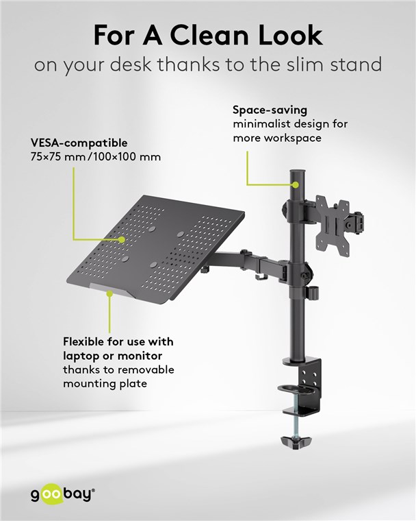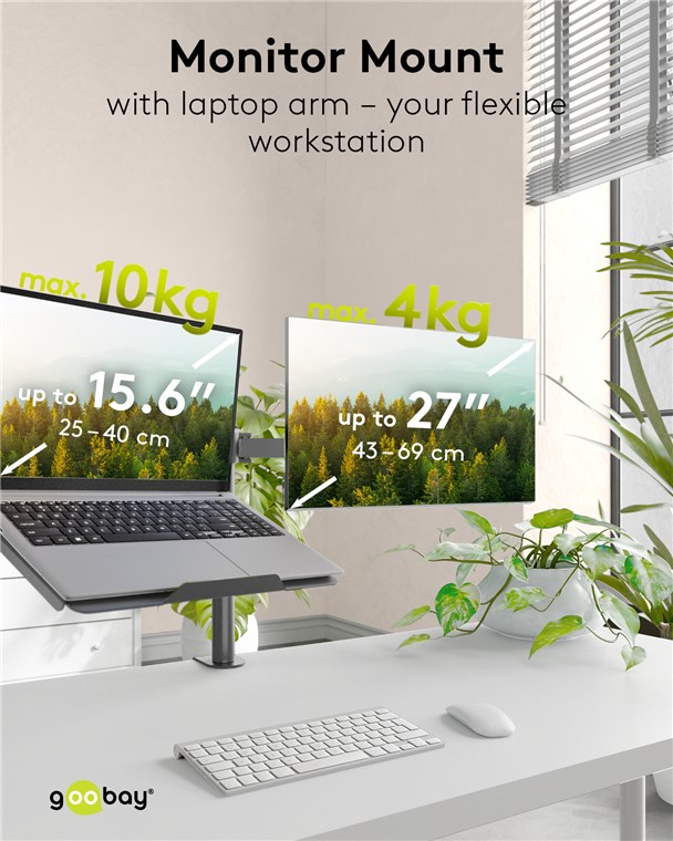 for laptops from 10–15.6 inches (25–40 cm) and monitors from 17–27 inches (43–69 cm), max. 10 kg