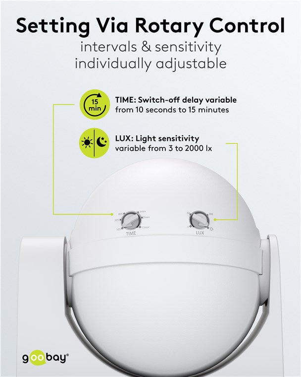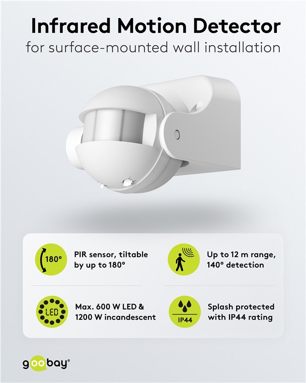 Wind and weather? No problem, the motion detector is IP44-rated, making it perfect for outdoor areas such as gardens, carports or house entrances. Simply connect it to path or outdoor lighting to avoid tripping hazards at dusk and in the dark. Motion detectors from Goobay – always feel safe and sound.