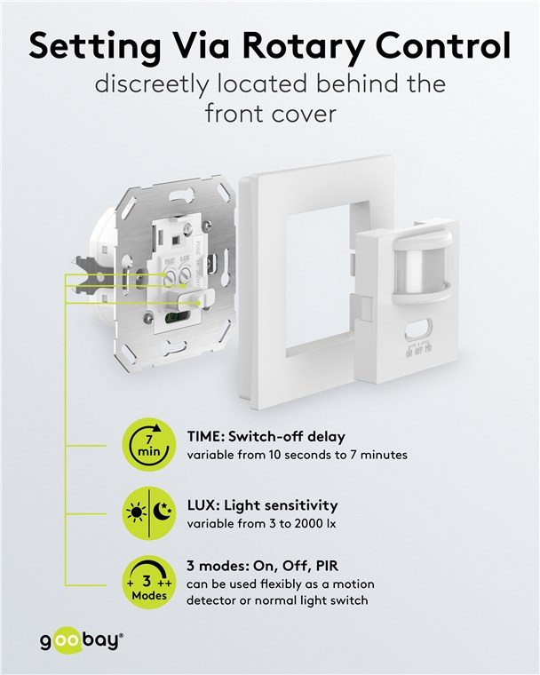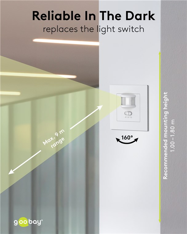 Perfectly integrated into your interior design: The motion detector is installed super-flat in a wall box and, with its simple, square design, fits in with many common switch ranges. You can conveniently switch the sensor on and off as required using the front switch.