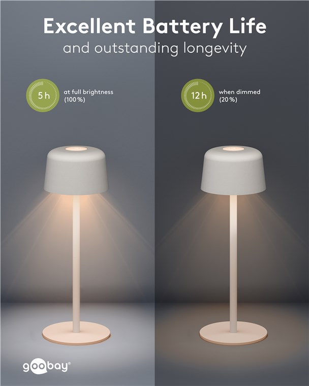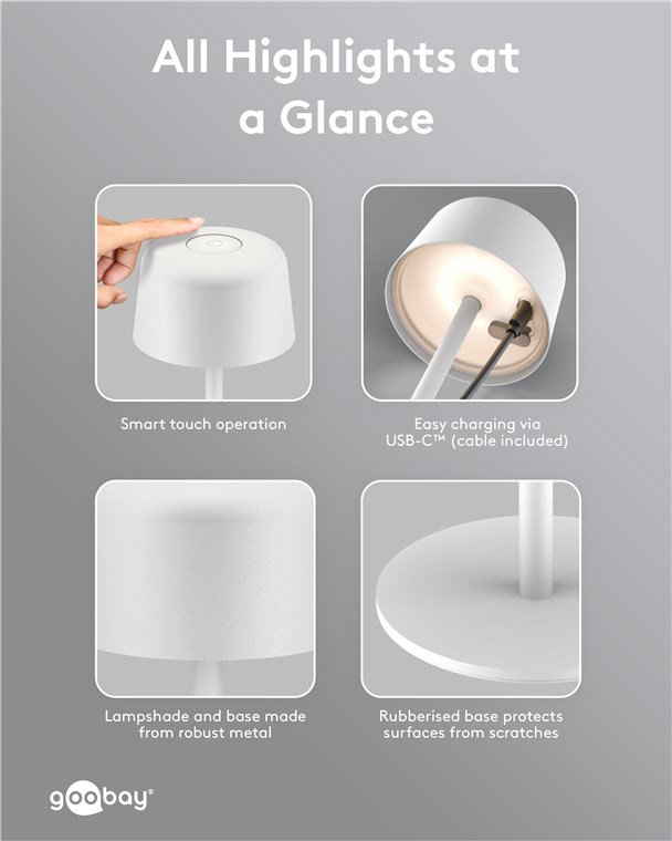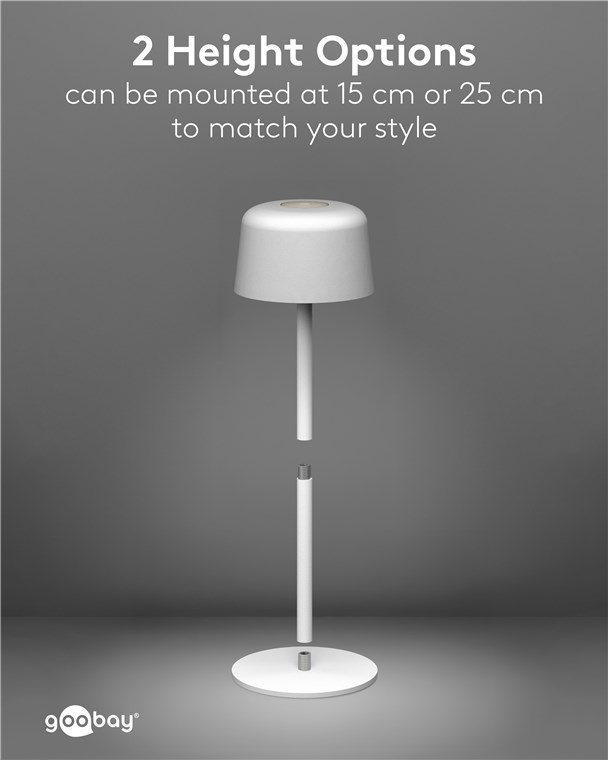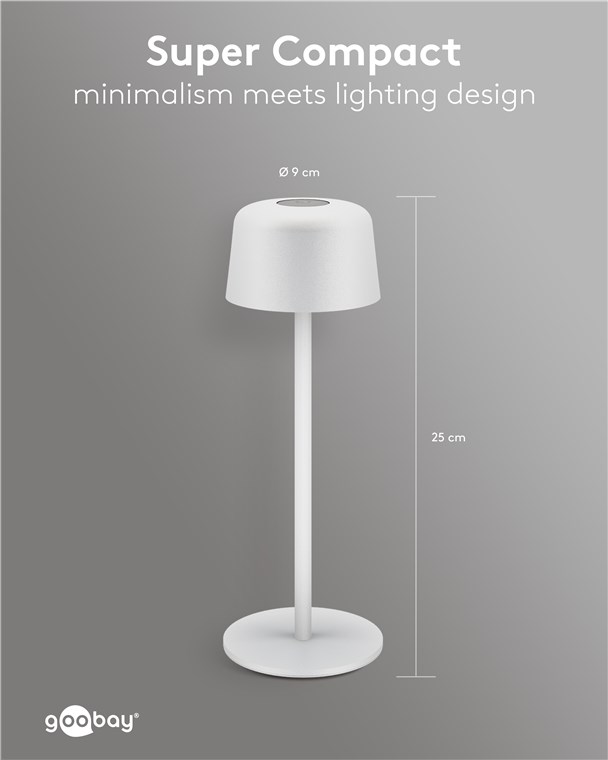 With its minimalist, Scandinavian design, the small table lamp refines any living room, bedroom or dining room and makes a style statement at every garden party. Made from high-quality, solid metal, the innovative Goobay light stands for quality and durability.