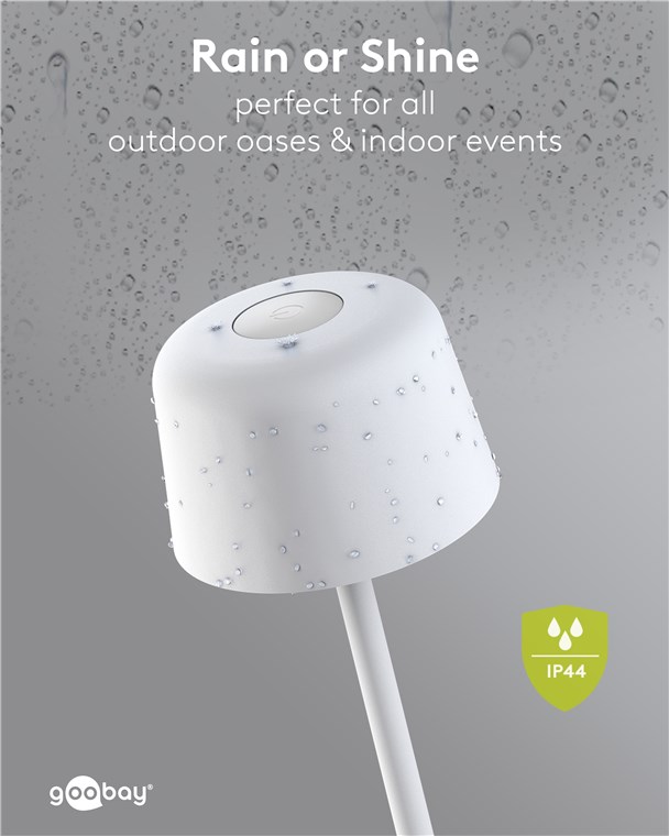 - Thanks to its splash water protection (protection class IP44), the table lamp is also perfect for the patio, balcony or garden