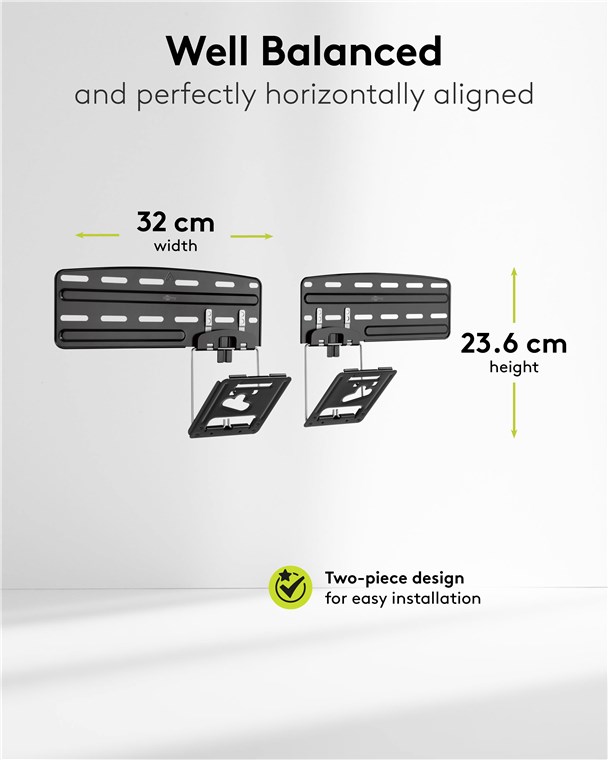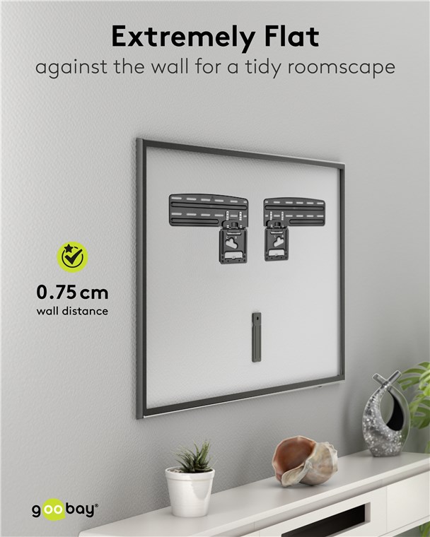 - Support TV ultraplat avec une distance au mur de seulement 7,5 mm, grâce auquel l'appareil affleure presque le mur et ne dépasse pas dans la pièce