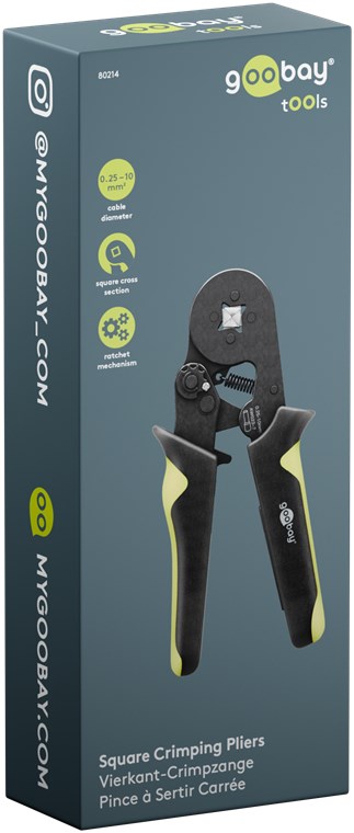 La tua nuova pinza preferita per la crimpatura di cavi a trefoli su capicorda per quadri elettrici o scatole di derivazione: La crimpatura a sezione quadrata riduce gli spazi vuoti tra i trefoli, creando così un collegamento compatto con il cavo – per basse resistenze di contatto e un collegamento preciso e durevole. Scegli un lavoro pulito senza fili sfilacciati. Con la pinza crimpatrice di Goobay.