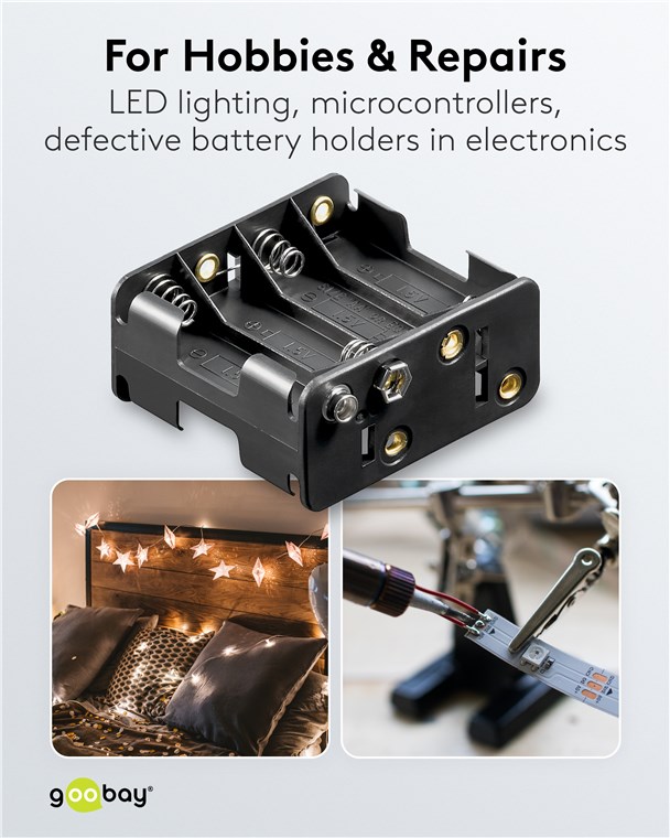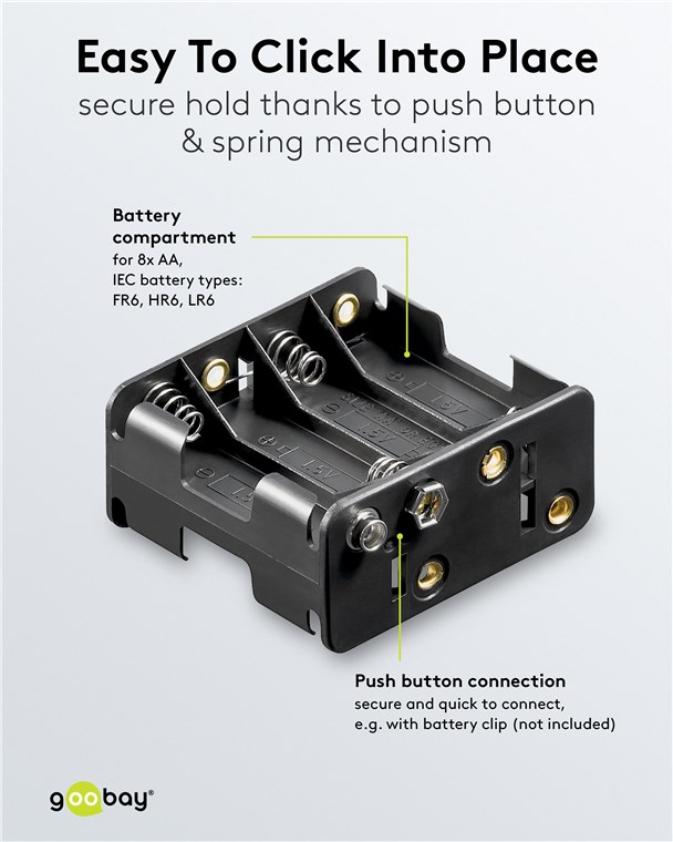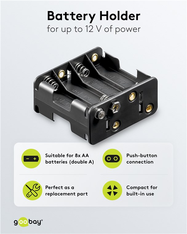 - Uchwyt na baterie Goobay może być wbudowany w urządzenie zasilane bateriami lub do niego dołączony.