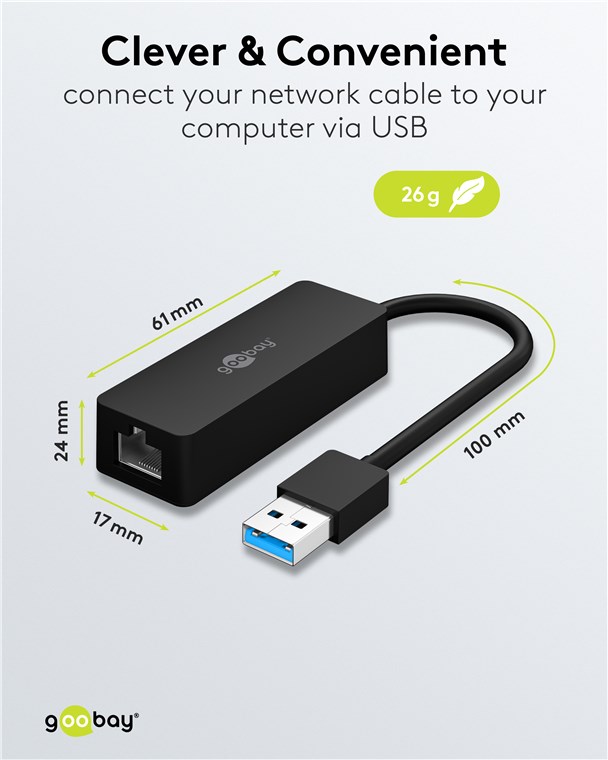 - Adapter USB LAN do połączenia sieciowego full-duplex 10/100/1000 Mbit/s przez gniazdo USB-A komputera