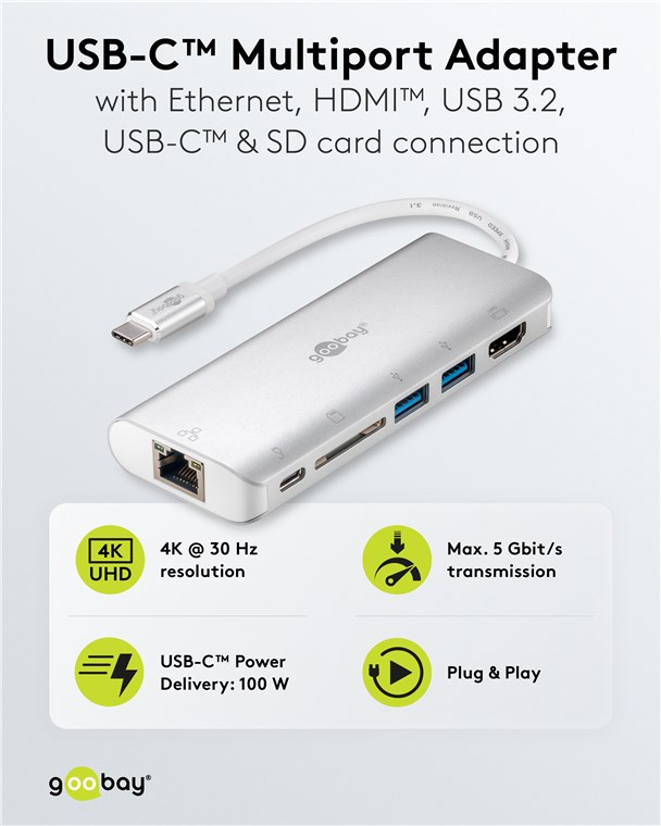 4K @ 60 Hz, PD 100 W, rozszerza port USB-C™ o 1x Ethernet, 1x HDMI™, 1x USB-C™ (PD), 2x USB-A (USB 3.2) i 1x gniazdo kart SD