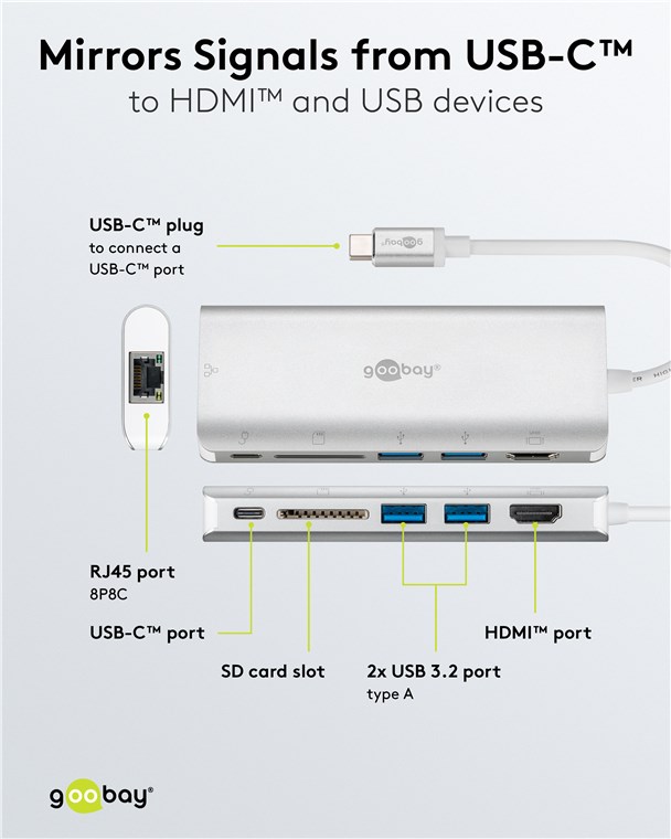 Adapter wieloportowy USB-C™ do HDMI™, USB-A, czytnika kart, RJ45, aluminium, srebrny