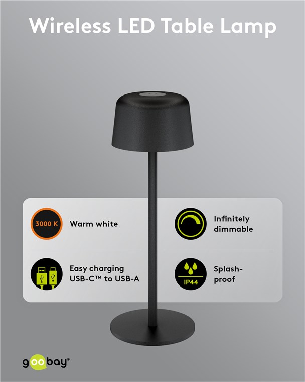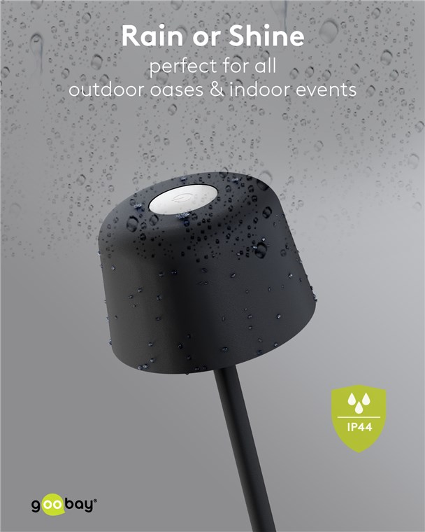 - Dzięki ochronie przed bryzgami wody (stopień ochrony IP44), lampa stołowa jest również idealna na patio, balkon lub do ogrodu