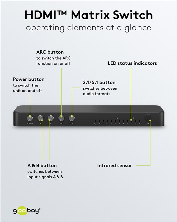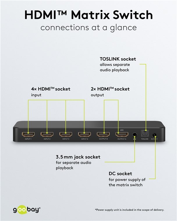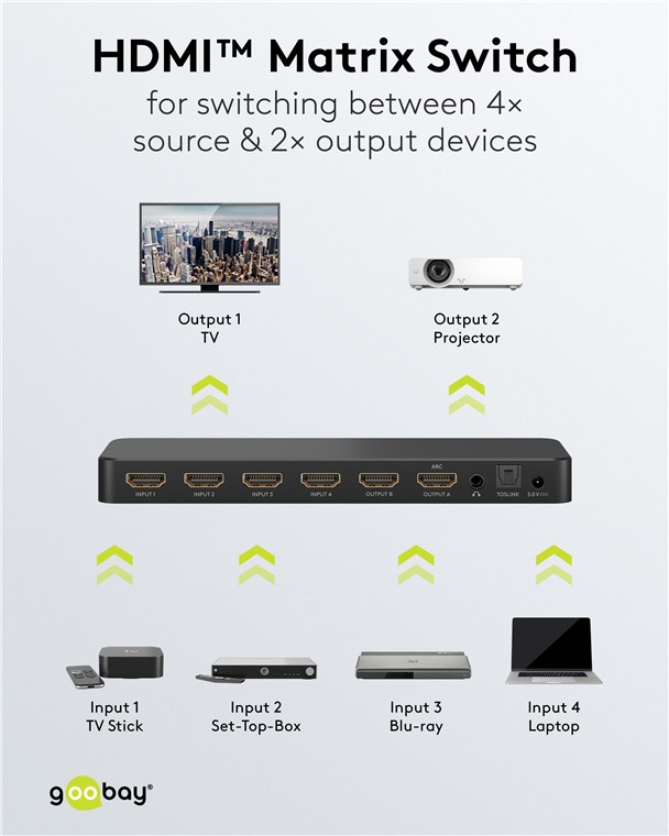 • Przełącznik HDMI™ przesyła do 4x sygnałów wejściowych HDMI™ do 2x wyjść, umożliwiając odtwarzanie obrazu i dźwięku na wielu urządzeniach, takich jak telewizor, projektor czy monitor.