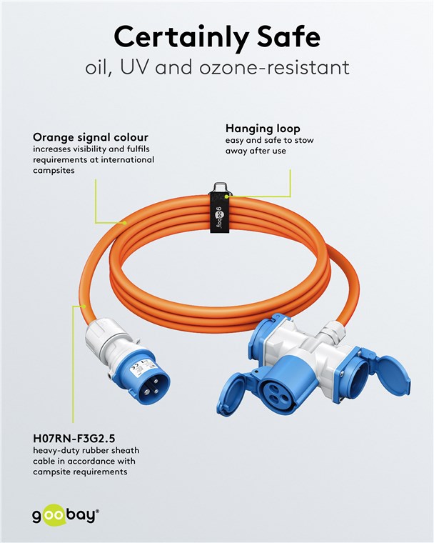 - Wytrzymały przewód gumowy H07RN-F 3G2.5 o przekroju 2,5 mm² wymagany na kempingach