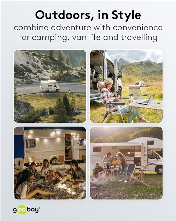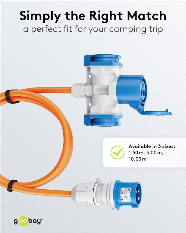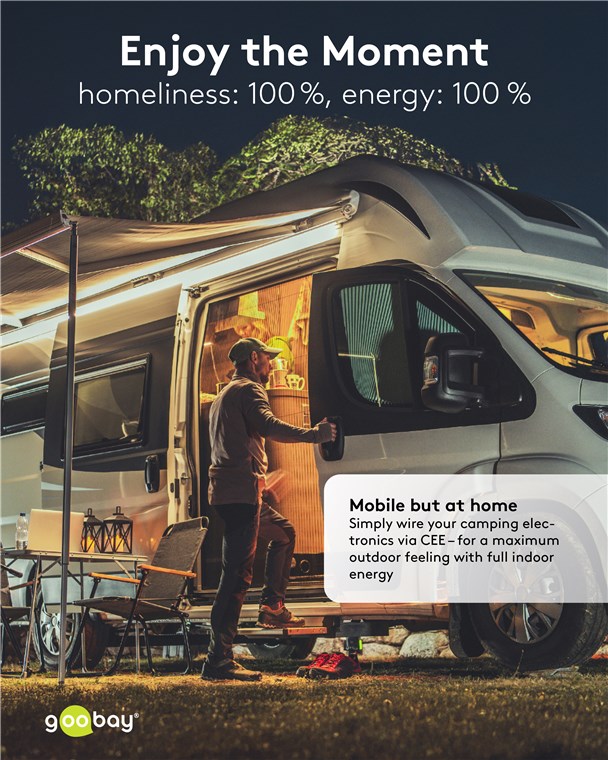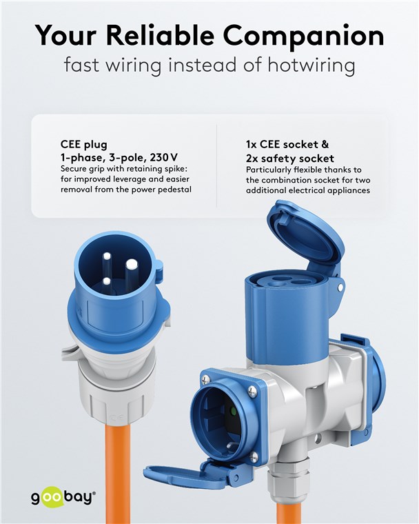 - Podstawowe akcesorium kempingowe: Adapter CEE z gniazdem combi do podłączania kamperów, przyczep kempingowych lub samochodów kempingowych do sieci elektrycznej na kempingu