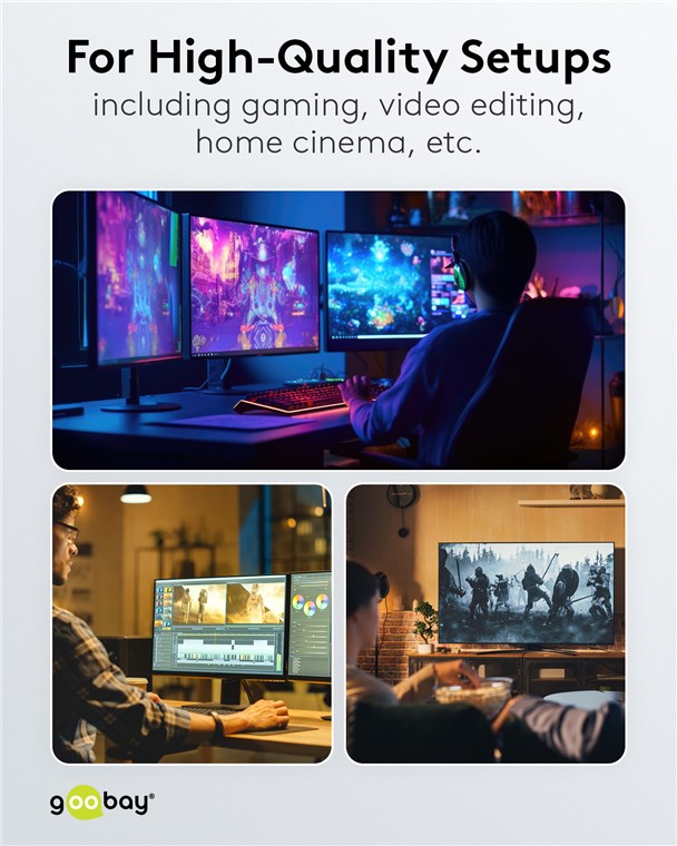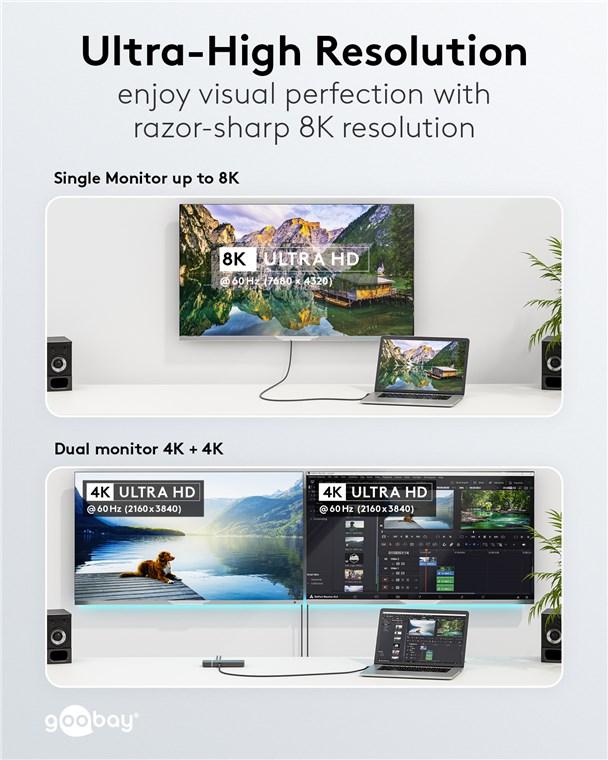 - Kabel obsługuje ultrawysokie rozdzielczości do 8K @ 60 Hz/4K @ 120 Hz na pojedynczych monitorach i 4K @ 60 Hz, gdy sygnał jest dzielony między dwa monitory za pośrednictwem koncentratora