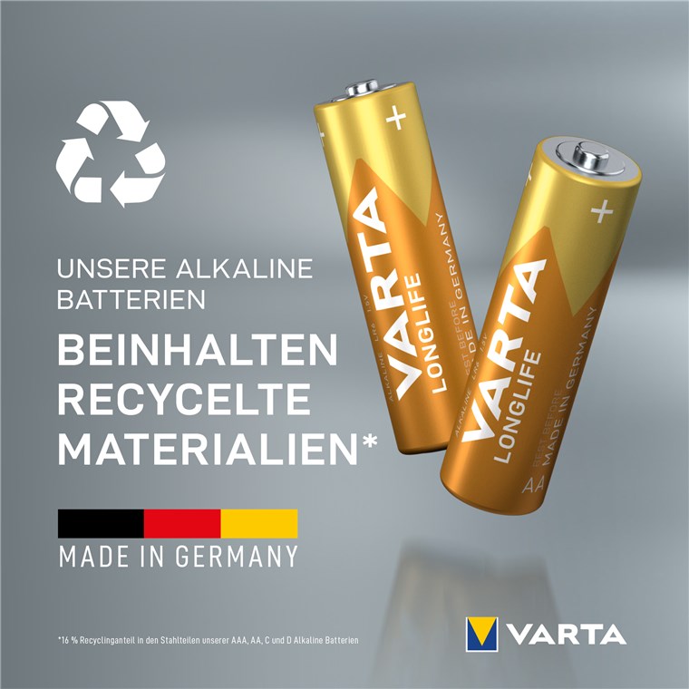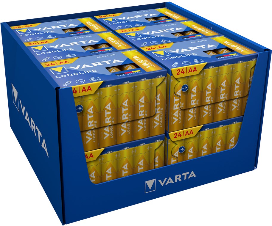 - Nieużywane i zapakowane baterie alkaliczne VARTA AA pozostają świeże i naładowane nawet przez 10 lat.