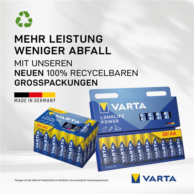 - Nieużywane i zapakowane baterie alkaliczne VARTA AA pozostają świeże i naładowane nawet przez 10 lat.