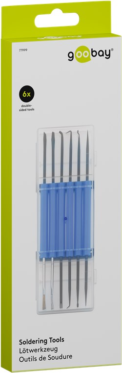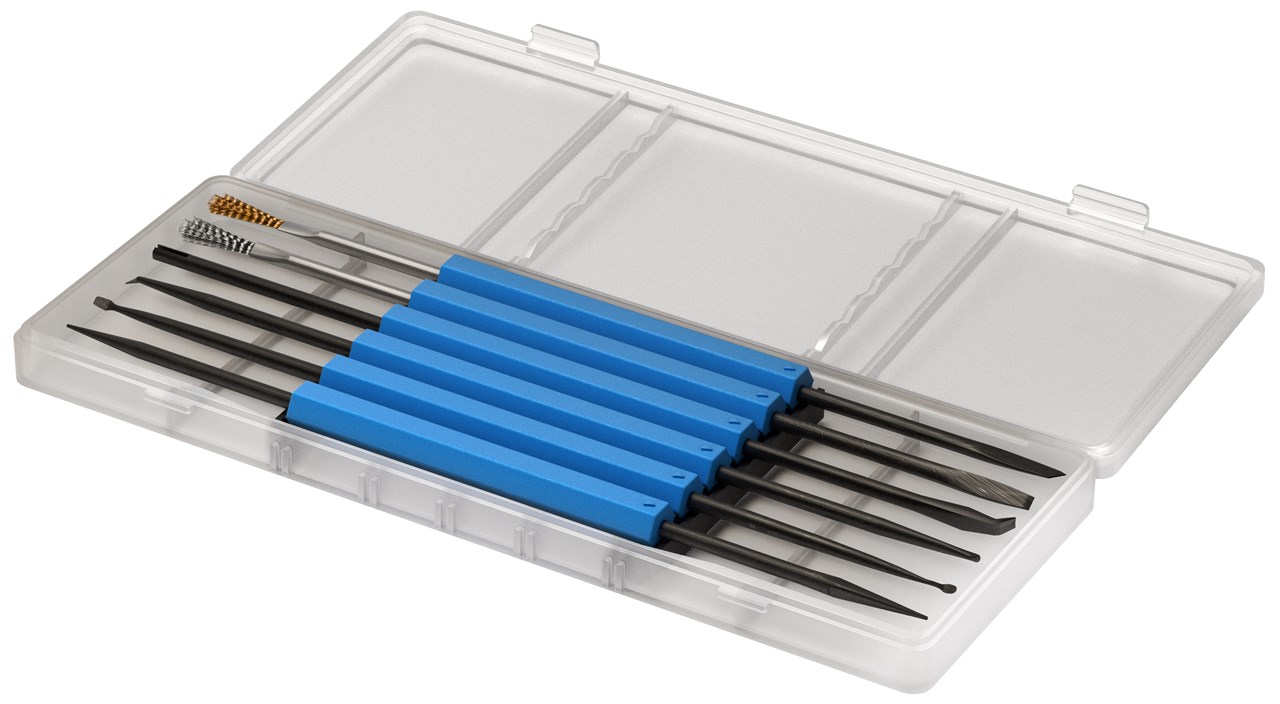 • 2x uchwyt chipów, 1x rozwiertak o okrągłym przekroju do czyszczenia otworów w płytkach, 1x dźwignia i 1x hak do wyjmowania elementów płytek, 2x ostry skrobak do usuwania korozji