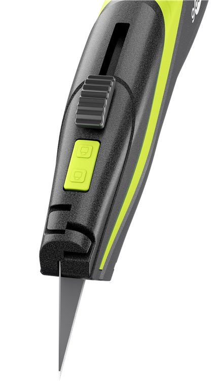 • Ergonomicznie ukształtowany nóż roboczy z automatycznym chowaniem ostrza do bezpiecznego cięcia kartonu, folii, taśmy klejącej, tworzyw sztucznych itp.