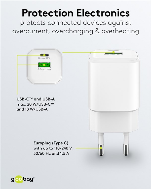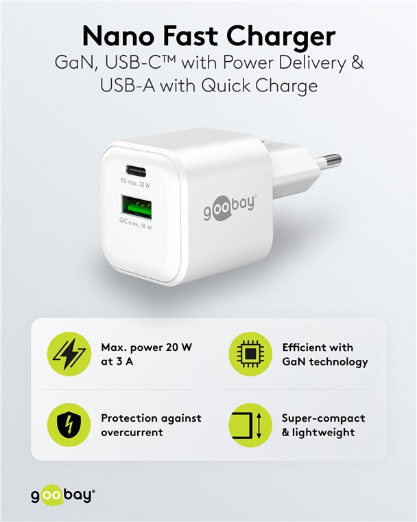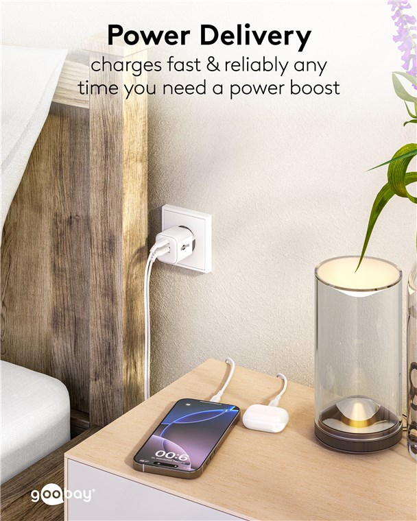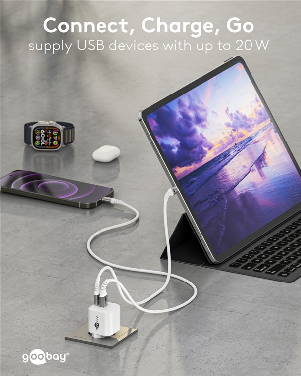 - Dzięki mocy 20 W, adapter ładowania jest specjalnie zaprojektowany do małych urządzeń, takich jak smartfony, słuchawki Bluetooth, tablety lub czytniki e-booków