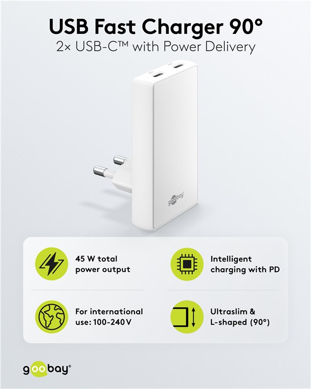 Podwójna szybka ładowarka USB-C™ PD GaN 90° Flat (45 W) biały