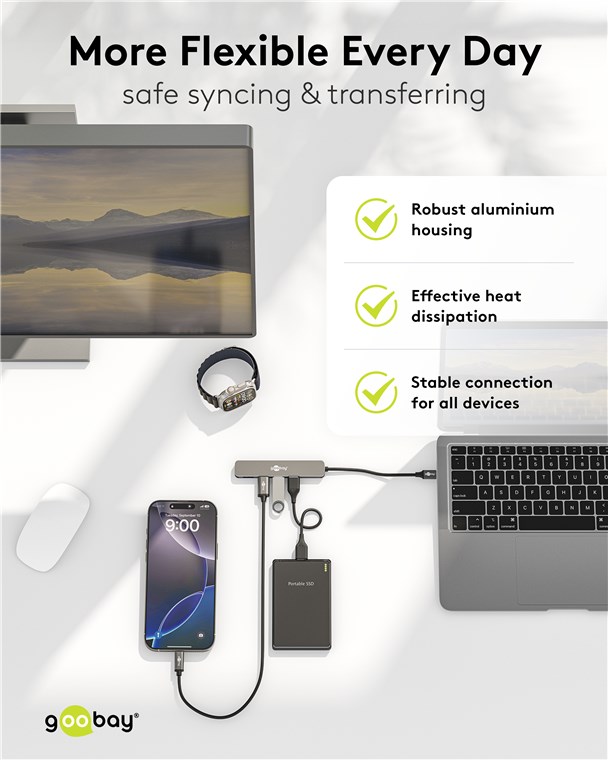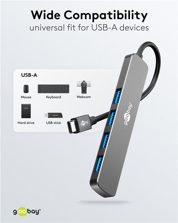 Maksymalna łączność dla każdego tabletu, smartfona lub laptopa za pomocą tylko jednego portu USB-C™: Smukły hub zwielokrotnia liczbę połączeń odpowiednich dla wszystkich urządzeń USB-A, zapewniając jednocześnie superszybką transmisję danych z prędkością 5 Gbit/s. Nigdy więcej irytującego przełączania lub zbyt małej liczby portów – praktyczny adapter wieloportowy jest idealnie przygotowany na wszystkie cyfrowe wyzwania.