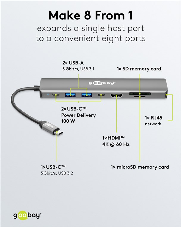 • Praktyczny USB-C™ hub rozszerza jeden port USB-C™ do osiem portów: Pojedynczy port tabletu lub laptopa może obsługiwać do ośmiu urządzeń peryferyjnych