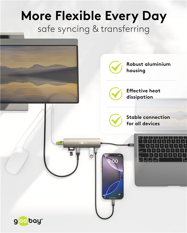 Maksymalna łączność dla każdego tabletu, smartfona lub laptopa za pomocą tylko jednego portu USB-C™: Dzięki hubowi możesz łatwo podłączyć karty pamięci, urządzenia HDMI™ i USB za pomocą portu USB-C™ w laptopie. Możesz nawet podłączyć kabel sieciowy przez USB. Bardzo praktyczne, jeśli Twój laptop nie ma własnego portu RJ45, a nie chcesz polegać na Wi-Fi. Szybkie podłączenie, bezpieczne przesyłanie strumieniowe!