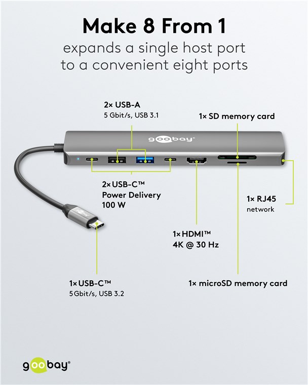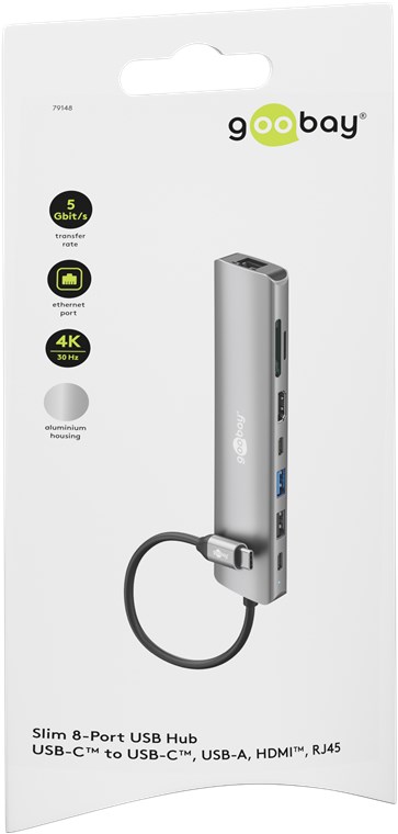 Maksymalna łączność dla każdego tabletu, smartfona lub laptopa za pomocą tylko jednego portu USB-C™: Dzięki hubowi możesz łatwo podłączyć karty pamięci, urządzenia HDMI™ i USB za pomocą portu USB-C™ w laptopie. Możesz nawet podłączyć kabel sieciowy przez USB. Bardzo praktyczne, jeśli Twój laptop nie ma własnego portu RJ45, a nie chcesz polegać na Wi-Fi. Szybkie podłączenie, bezpieczne przesyłanie strumieniowe!
