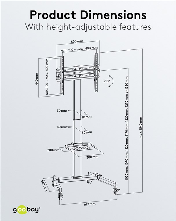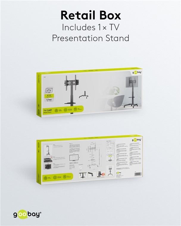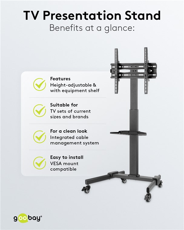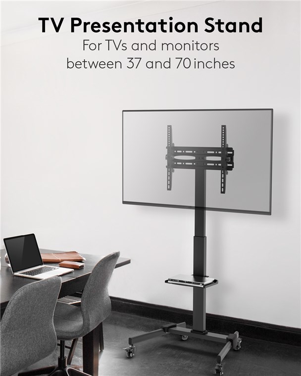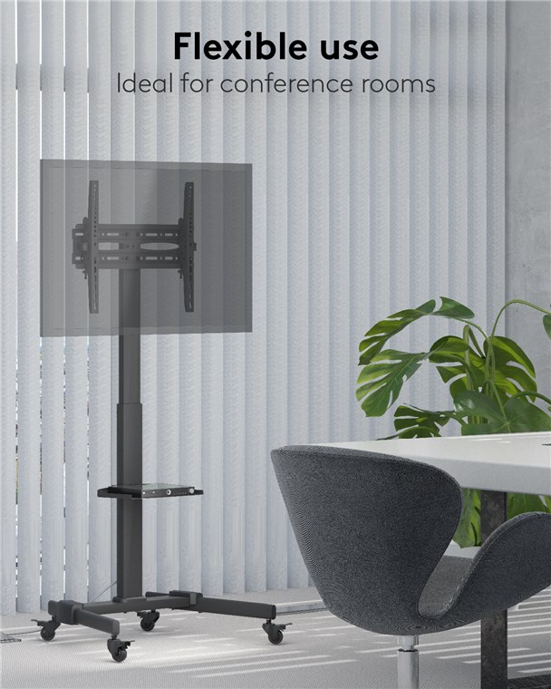 Dzięki 4 kółkom z możliwością blokady, stojak TV jest idealny do wykorzystania podczas konferencji, w salach wykładowych i recepcyjnych. Teleskopowa podstawa, uchwyt uchylny i 8 różnych poziomów wysokości zapewniają maksymalną elastyczność. Regulacja wysokości jest szczególnie przyjazna dla użytkownika dzięki systemowi zatrzaskowemu.