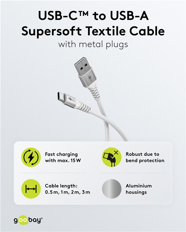 Super miękki kabel tekstylny USB-C™ do USB-A z metalowymi złączami, 0,5 m, biały