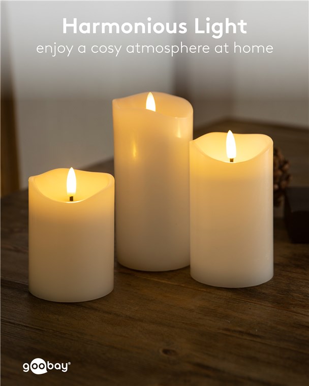 - Stylowa świeca filarowa z pokrywą z prawdziwego wosku zapewniająca ciepłe światło świecy z naturalnie wyglądającym, migoczącym płomieniem – całkowicie elektryczne i całkowicie bezpieczne