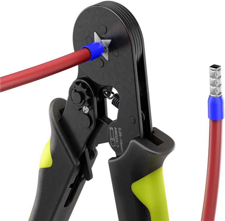 - Szczypce do zaciskania końcówek na przewodach wielożyłowych, np. w instalacjach elektrycznych, szafach sterowniczych, układach sterowania i okablowaniu przemysłowym