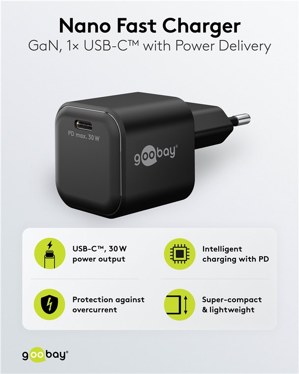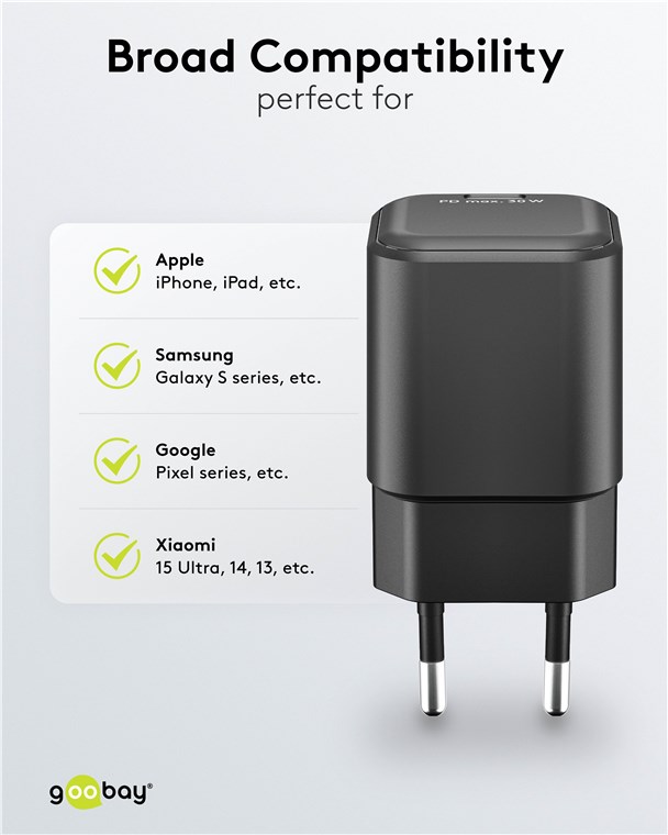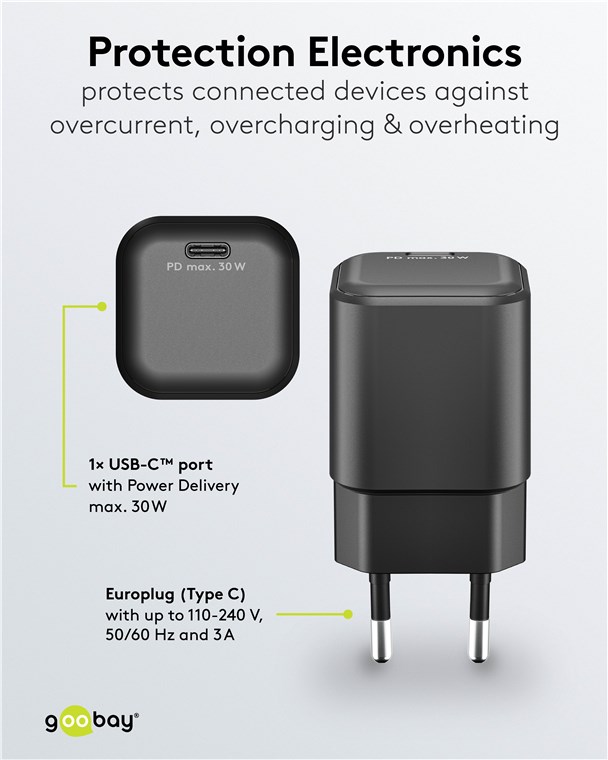 - Moc 30 W sprawia, że adapter do ładowania jest specjalnie dostosowany do małych urządzeń, takich jak smartfony, słuchawki Bluetooth, tablety czy powerbanki