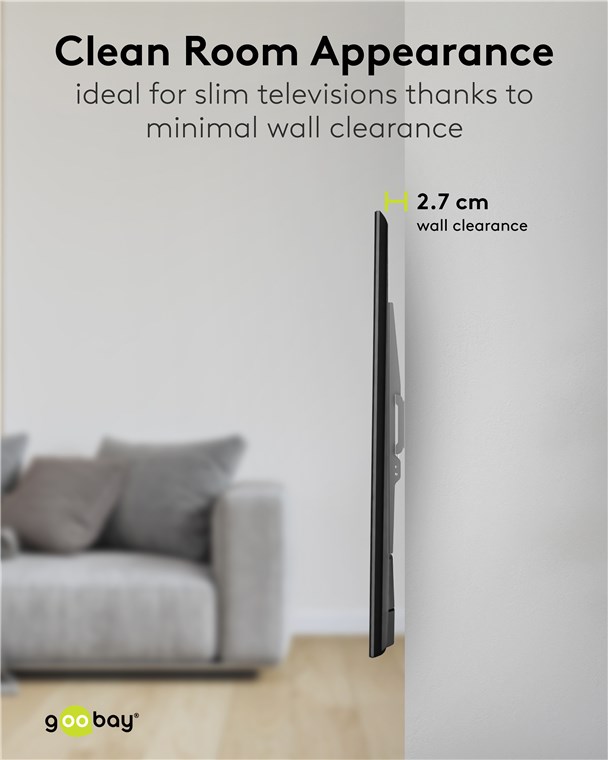 - Bardzo płaski uchwyt do telewizora do montażu na ścianie, zajmujący bardzo mało miejsca, z odległością od ściany wynoszącą zaledwie 2,7 cm