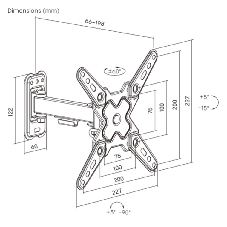 - Elastyczny uchwyt telewizyjny zapewniający optymalny kąt widzenia: możliwość pochylenia od +5° do -15° (w górę/w dół), obrotu o +60/-60° (w lewo/w prawo), obrotu o +5° do -90° i wysunięcia o 19,8 cm