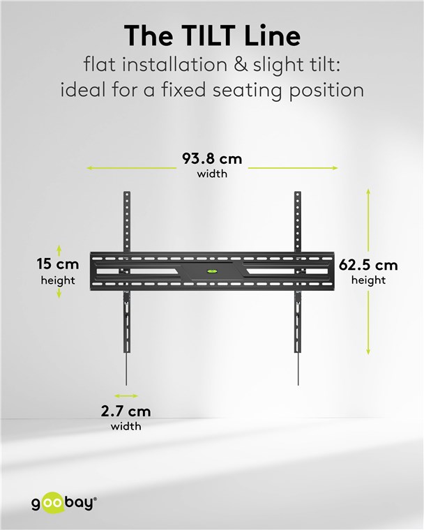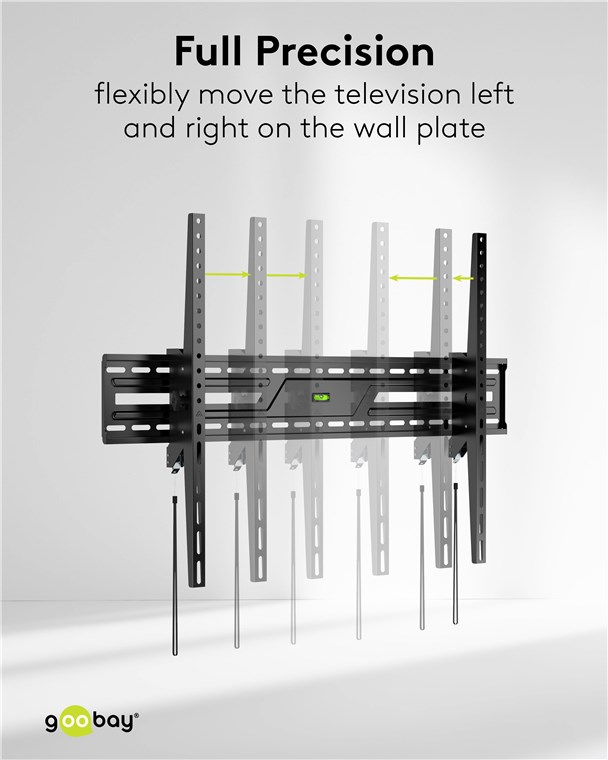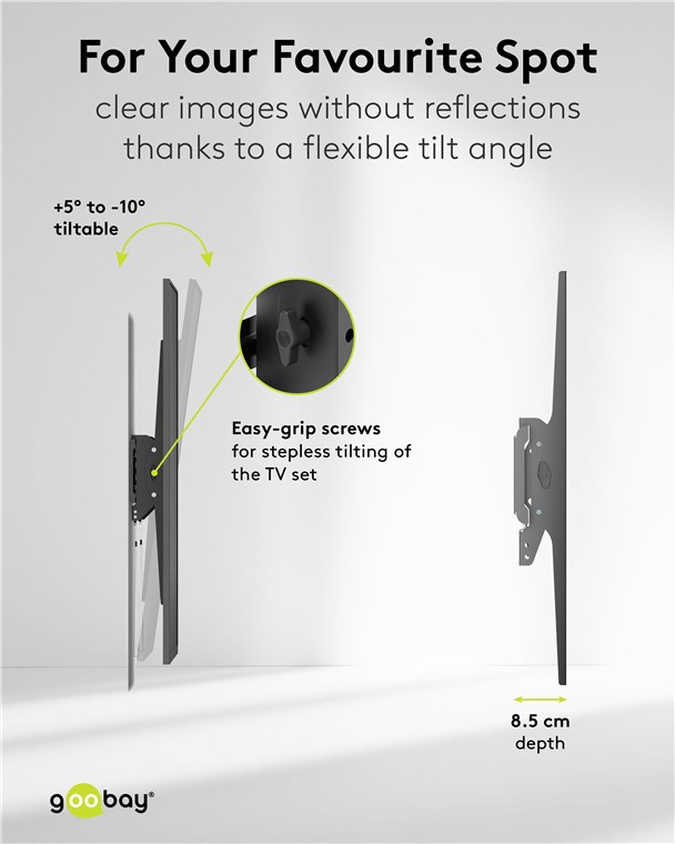 Twój telewizor zasługuje na coś lepszego niż zakurzona szafka z 2005 roku: odśwież wystrój swojego pokoju i zamocuj telewizor na ścianie, oszczędzając miejsce i zapewniając bezpieczeństwo. Płynna regulacja kąta nachylenia do 15° zapewnia odpowiednią pozycję bez odblasków i refleksów. Cechą szczególną jest system zatrzaskowy, który pozwala bezpiecznie zamocować telewizor na płycie ściennej. Dzięki pętlom na rękę można w każdej chwili łatwo odłączyć telewizor, np. w celu podłączenia innych kabli.