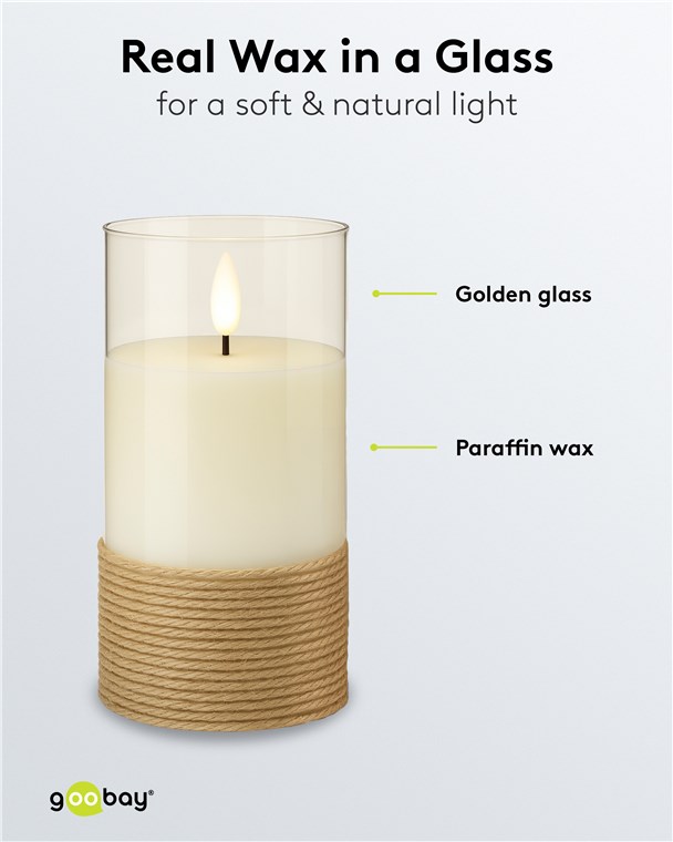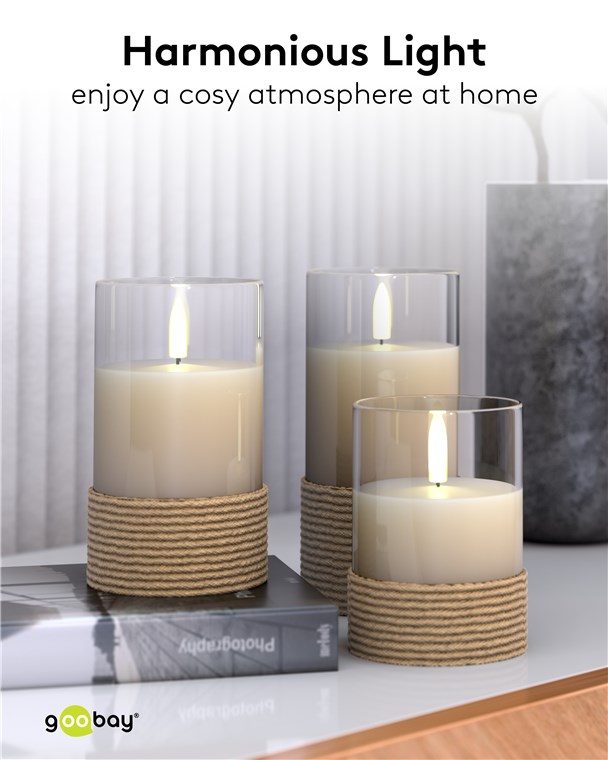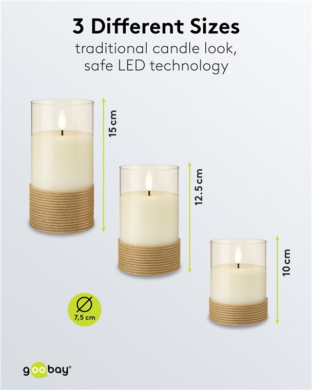 - Stylowe świece filarowe w trzech różnych rozmiarach z naturalnie wyglądającym, migoczącym płomieniem w przezroczystym szkle, owinięte konopiami – całkowicie elektryczne i całkowicie bezpieczne