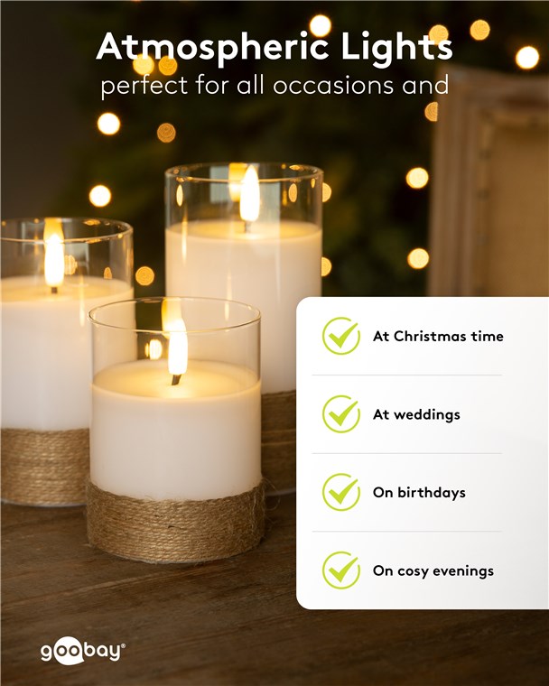 Tradycyjna elegancja prawdziwych świec woskowych spotyka się z nowoczesną, bezpieczną technologią oświetleniową: Dzięki realizmowemu efektowi migotania i woskowej osłonie zestaw świec tworzy ciepłą, harmonijną atmosferę prawdziwych świec – bez wypalania się, sadzenia lub stwarzania zagrożenia pożarowego. Stylowa dekoracja kolacji przez cały rok i magia Adwentu w okresie Bożego Narodzenia – idealna atmosfera na każdą okazję.