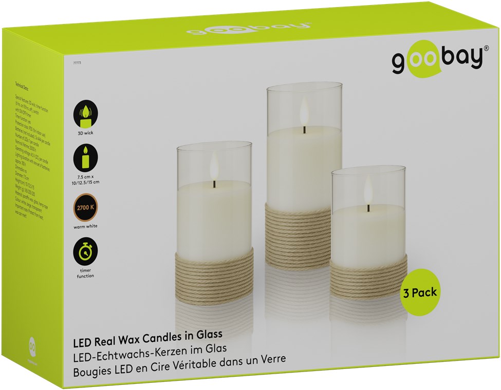 - Wymiary (wys. x Ø): 10 x 7,5 cm, 12,5 x 7,5 cm, 15 x 7,5 cm, każda świeczka LED zasilana 3 bateriami AAA (brak w zestawie)