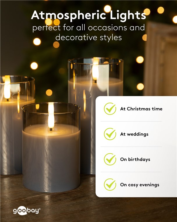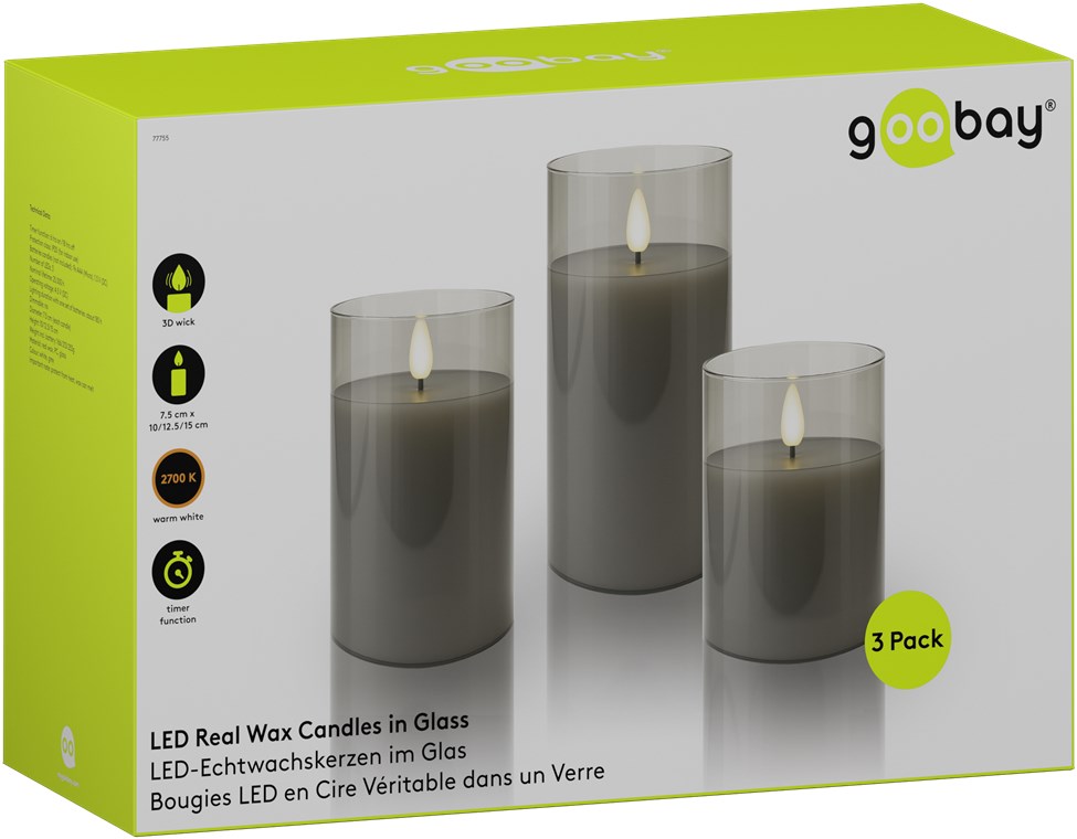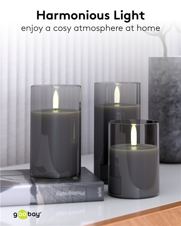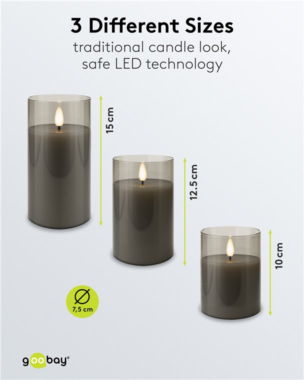 - Stylowe znicze w trzech różnych rozmiarach zapewniające ciepłe światło świec z naturalnie wyglądającym, migoczącym płomieniem w szarym szkle – całkowicie elektryczne i całkowicie bezpieczne