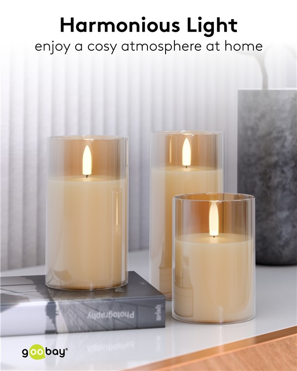 - Stylowe znicze w trzech różnych rozmiarach zapewniające ciepłe światło świec z naturalnie wyglądającym, migoczącym płomieniem w złotym szkle – całkowicie elektryczne i całkowicie bezpieczne