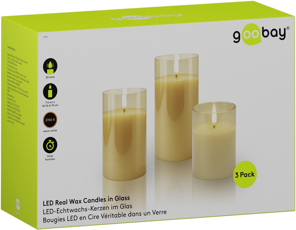 - Wymiary (wys. x Ø): 10 x 7,5 cm, 12,5 x 7,5 cm, 15 x 7,5 cm, każda świeczka LED zasilana 3 bateriami AAA (brak w zestawie)