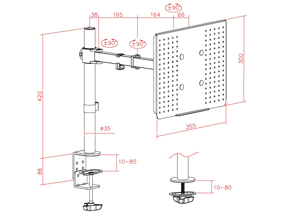 - Wysoka elastyczność dzięki zasięgowi 43 cm, regulacja wysokości, obrót o ±90° (w lewo/w prawo) i pochylenie o ±45° (w górę/w dół), obrót o ±180°, zalecana grubość blatu: 10–85 mm