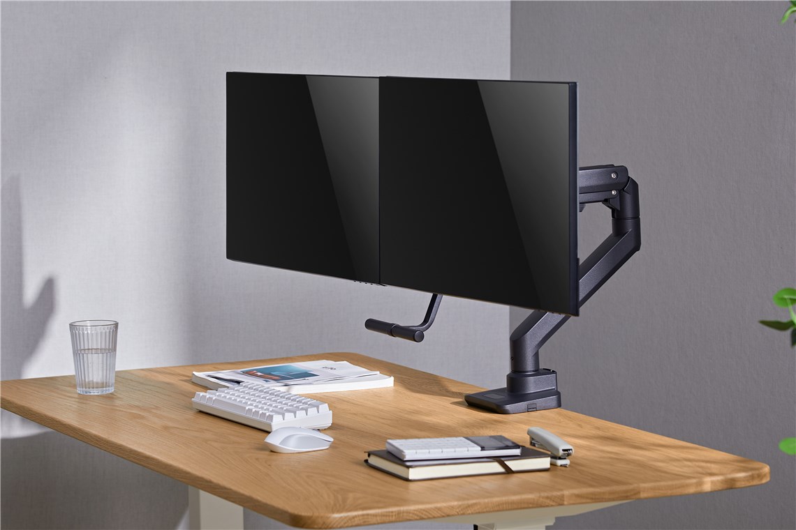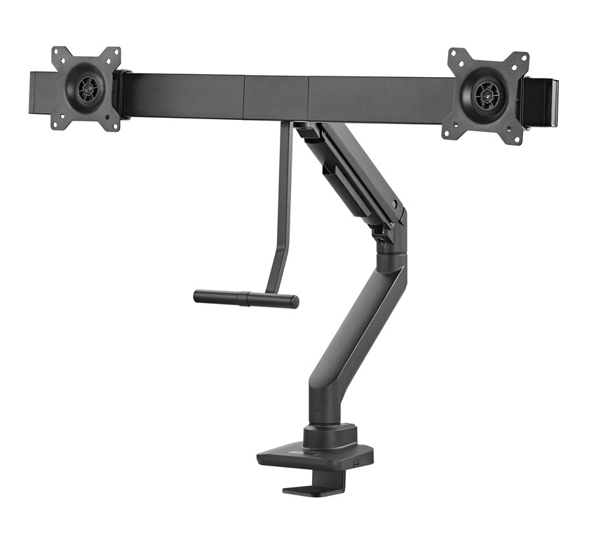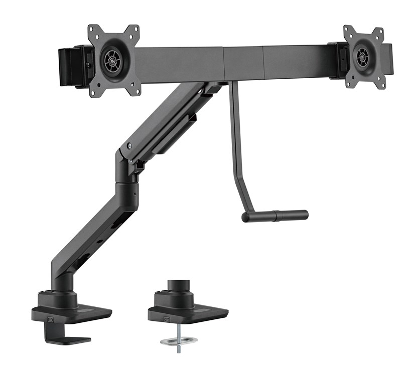 - Idealny do stabilnego montażu na stole dwóch ekranów o wadze do 9 kg każdy, z regulacją wysokości, odchylaniem ±10° i pochylaniem ±10°, obrotem 180°, zalecana grubość blatu: 12-50 mm