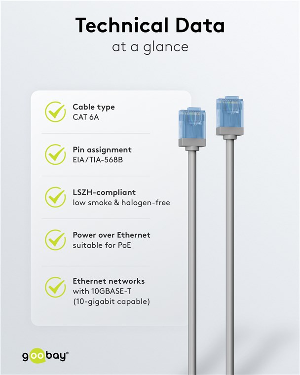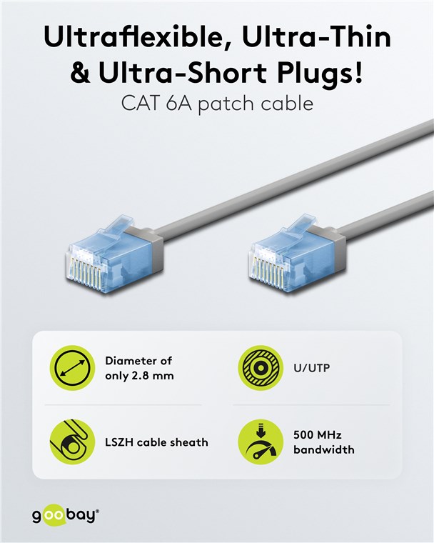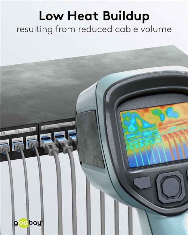 - Supercienki kabel LAN z bardzo krótkimi złączami RJ45 zapewnia mniejszą objętość kabla w szafie serwerowej lub panelu krosowym, a tym samym optymalną cyrkulację powietrza